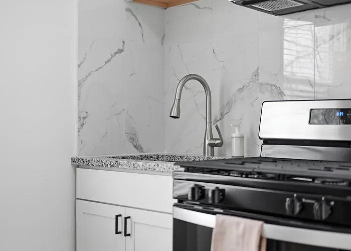 Una cocina completa en el apartamento Dormont, Pittsburgh !C Modern & Unique Private Bedroom With Shared Bathroom incluye lavaplatos y también horno. El tren urbano Dormont Junction está a 200 metros del apartamento.